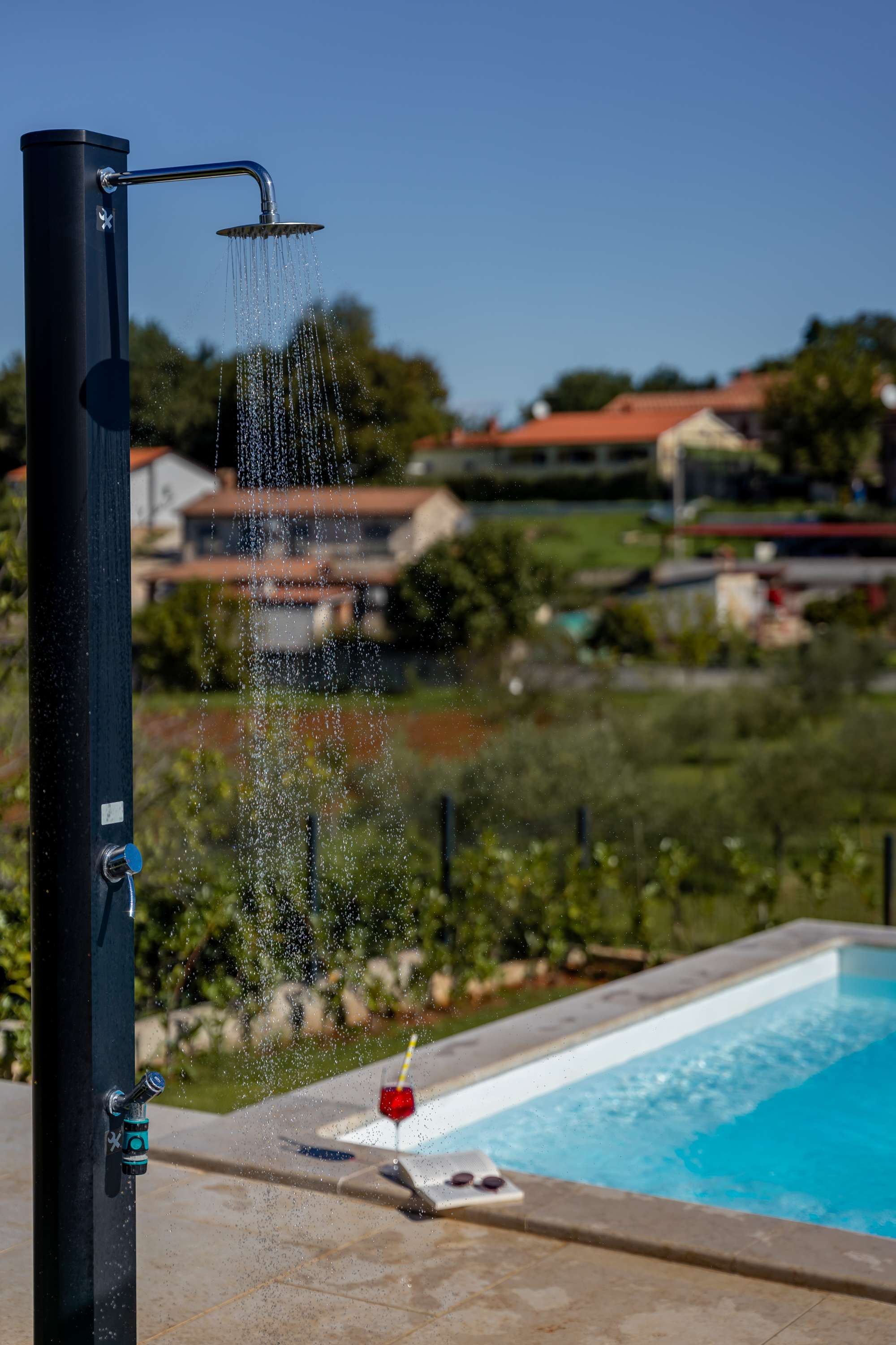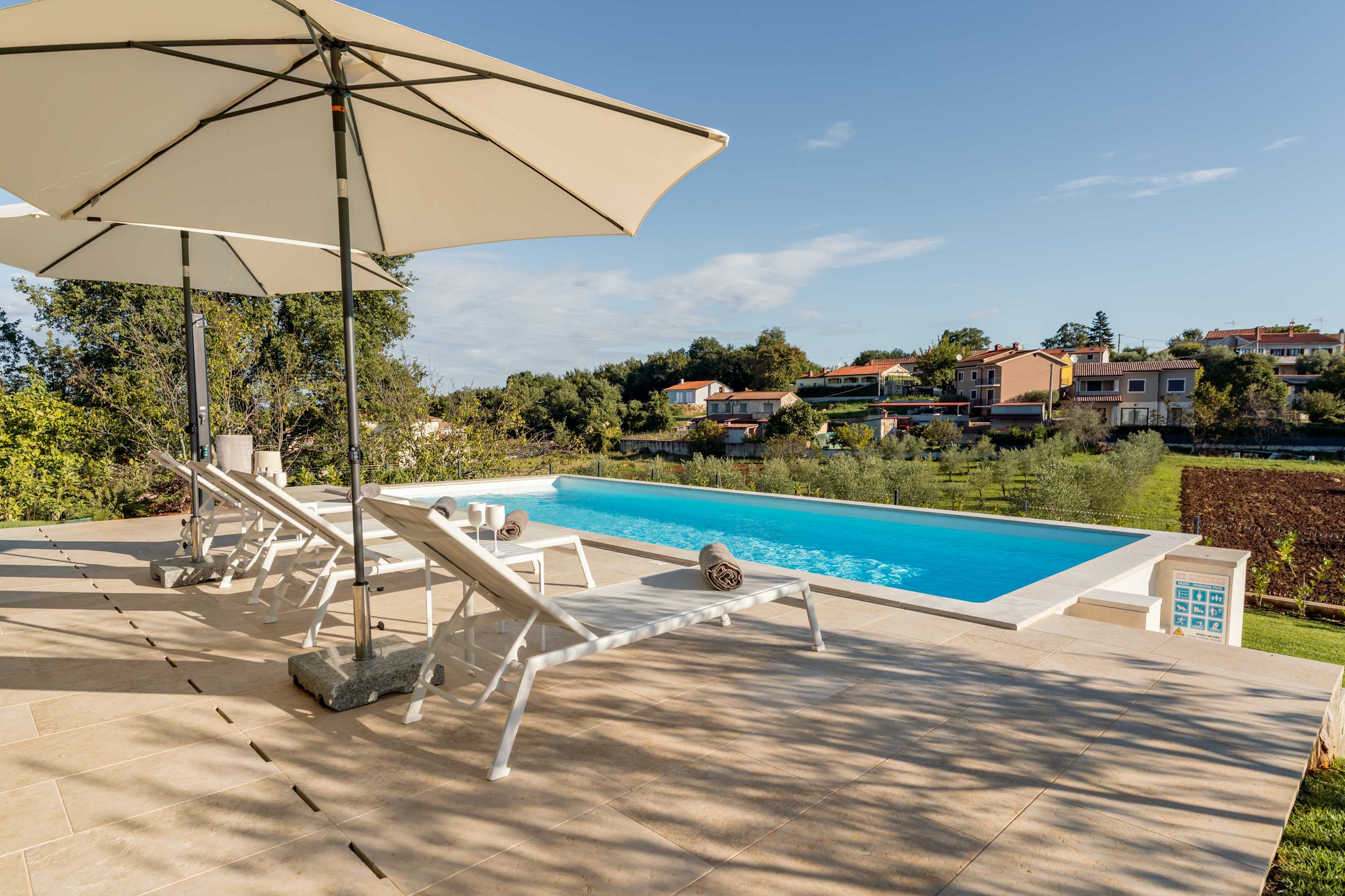 Boutique Villa Louisa is your perfect hideaway in the hills of Istria. Surrounded by olive trees, it offers a private garden, terrace with BBQ, lounge, pool, and outdoor shower. Inside: a stylish living area, fully equipped kitchen, and two en-suite bedrooms with terrace access. Comfort and tranquility for couples or families.