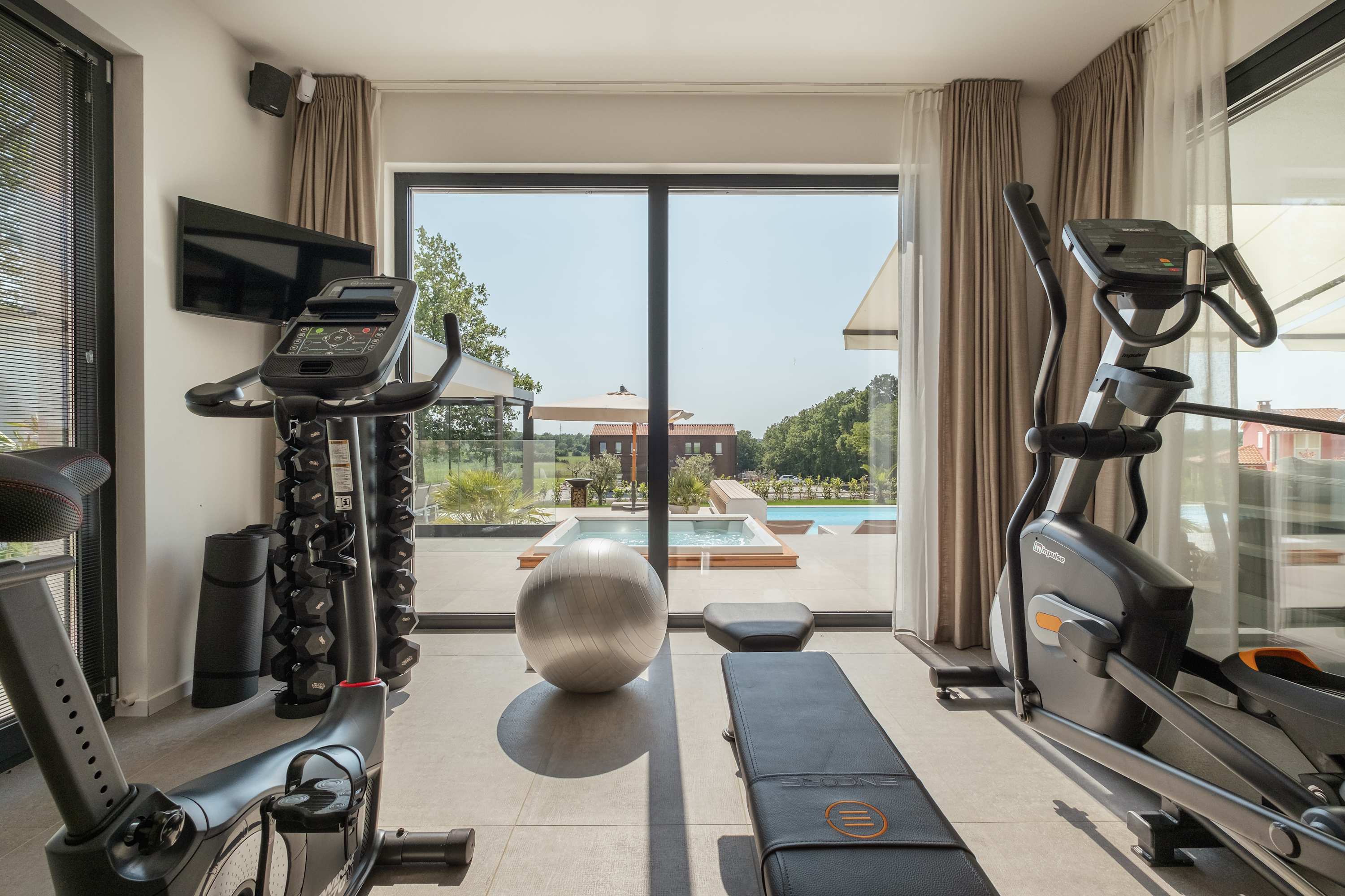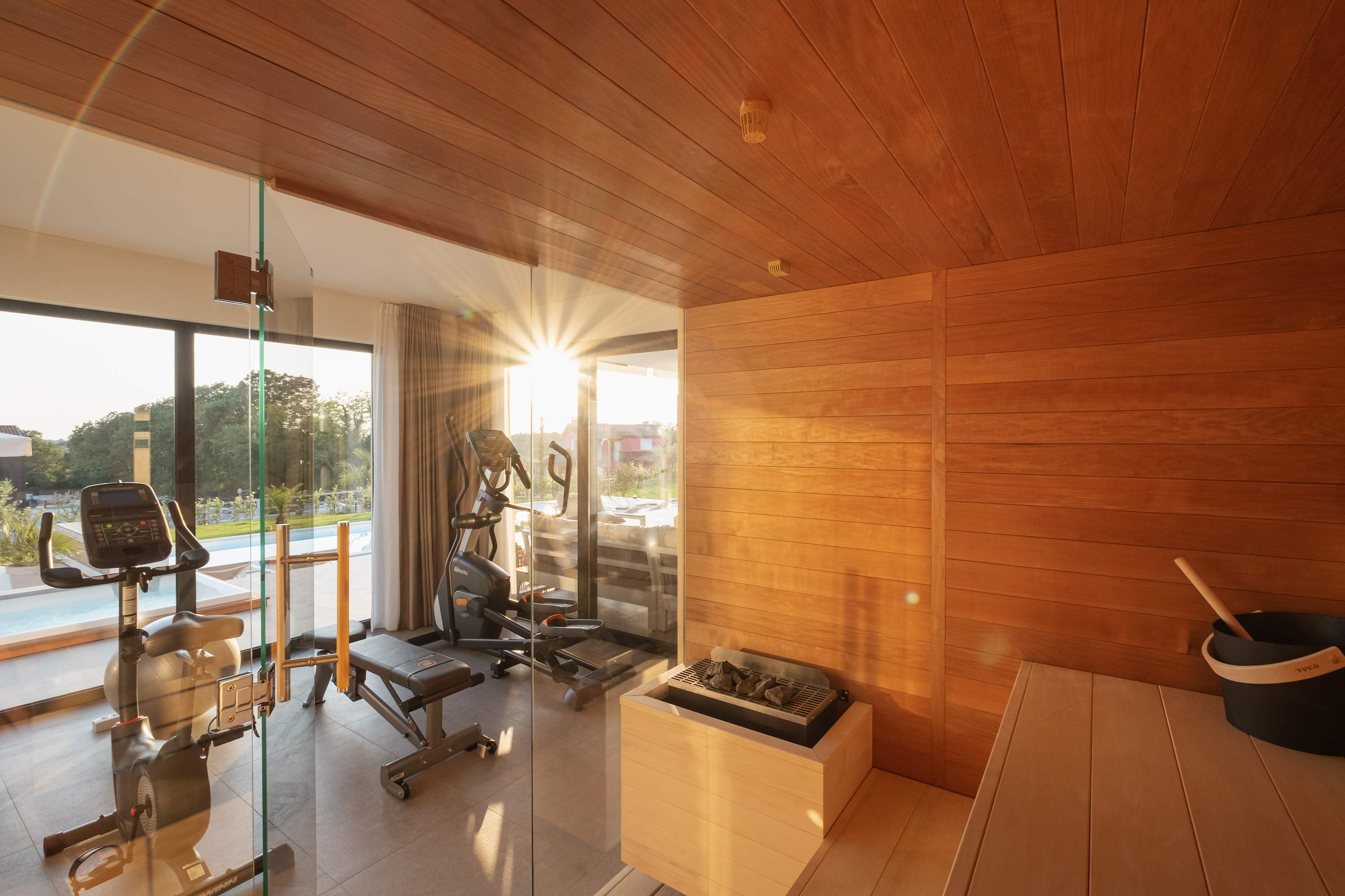 If you're in for a work-out, use your private gym with several fitness machines. After that, you can enjoy the sauna with a beautiful view over the pool and the garden.