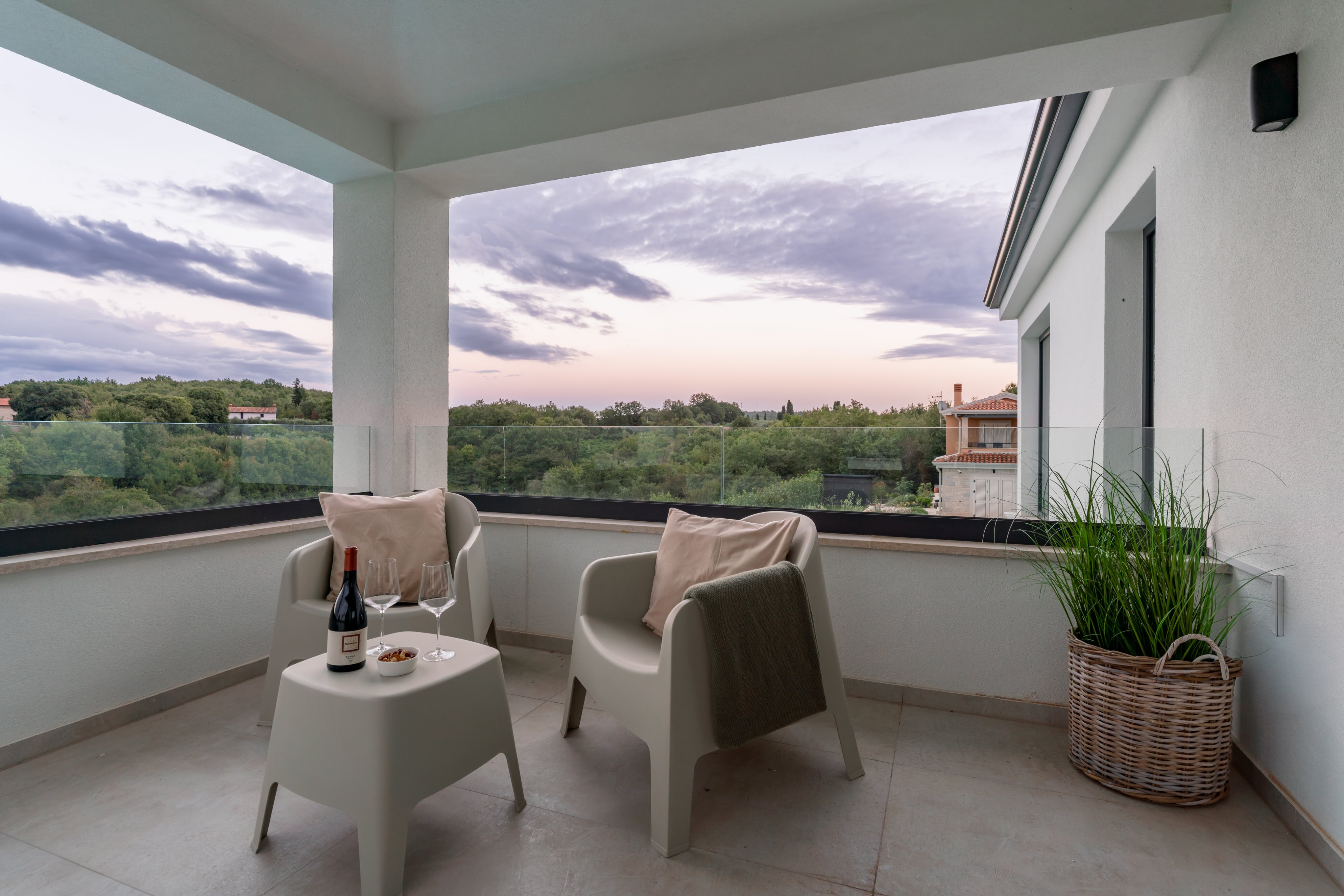 From the spacious balcony upstairs you will find the best view over the Istrian landscape with its olive groves. For the early birds; this is the best place for a cup of coffee at sunrise.